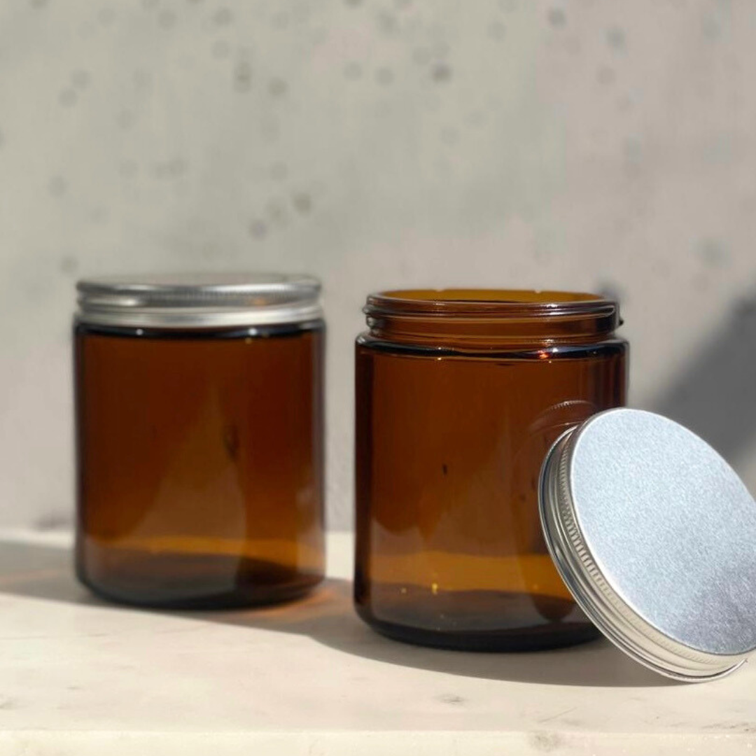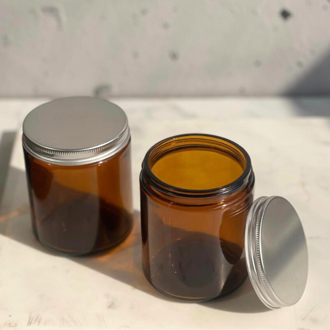 Envase de vidrio color ámbar con tapa de aluminio color plata.